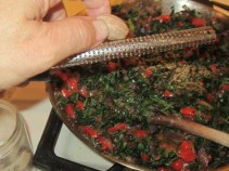 Add to the Cooked Spinach: Cooked & drained Mushrooms, Cooked Onion, Chopper Peppers,