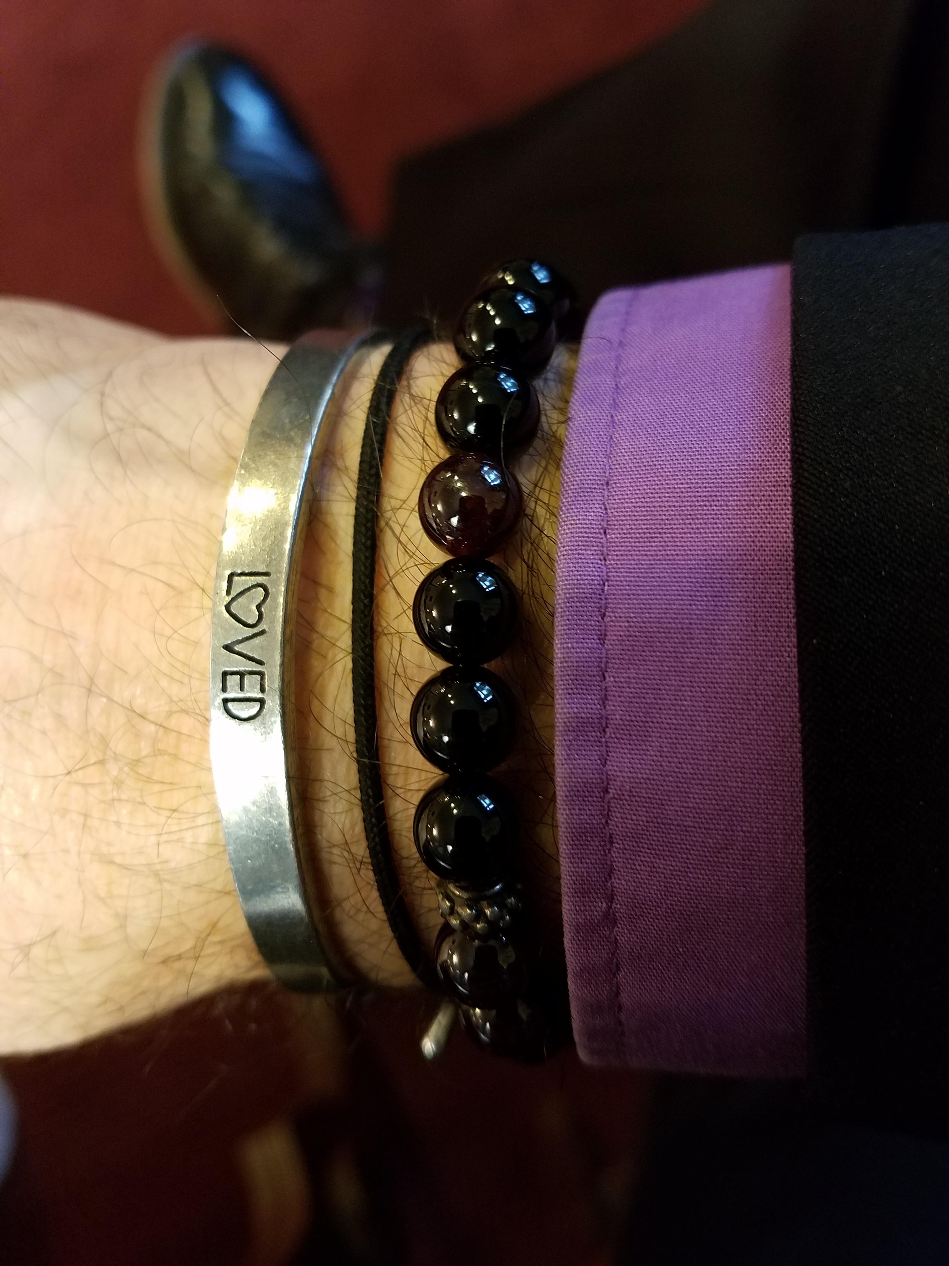 The bracelet we gave you a few months ago for your Birthday — a simple silver band that says “Loved,”