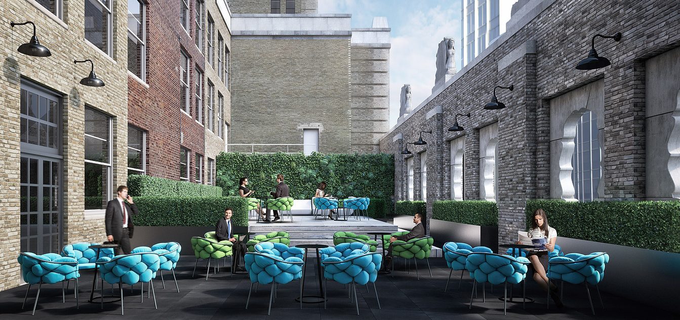 He explained to me that the office is in a building in Times Square, and there is an office room and a conference room, so it would be sort of my own room, but somehow part of another room. My assistant looked up the building address online, and one of the first images that came up was a terrace filled with mostly blue chairs and a green couch-like thing.