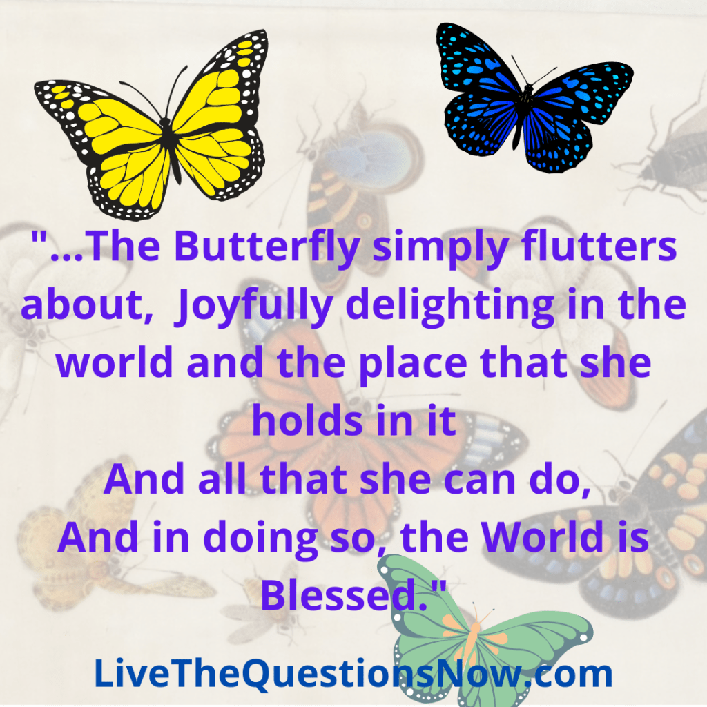 The Butterfly simply flutters about, from Brightly Colored Flower to Brightly Colored Flower, Joyfully delighting in the world and the place that she holds in it