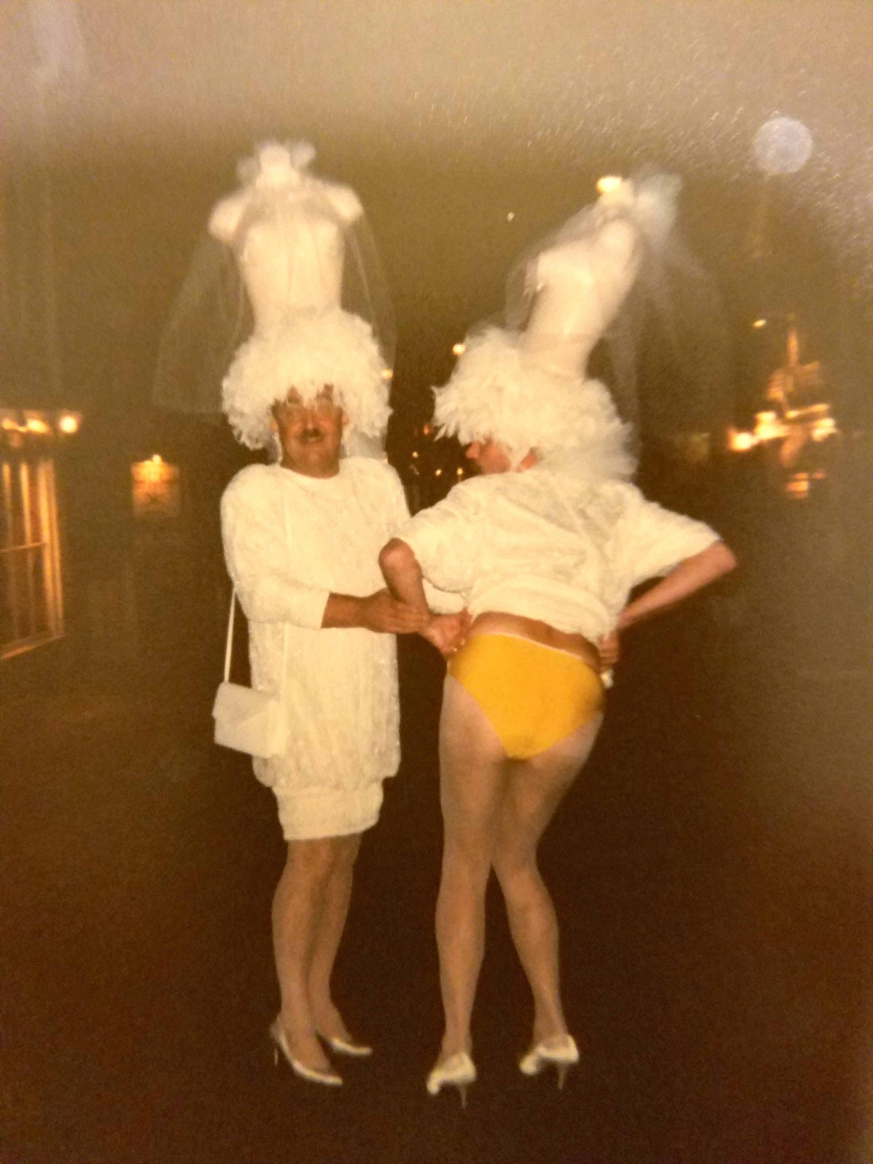 Two guys — big burly men with big burly mustaches who come to PTown every summer and dress in the most Fabulous drag outfits you could ever imagine with their big hairy arms, hairy chests, and these Hats — they defy description!